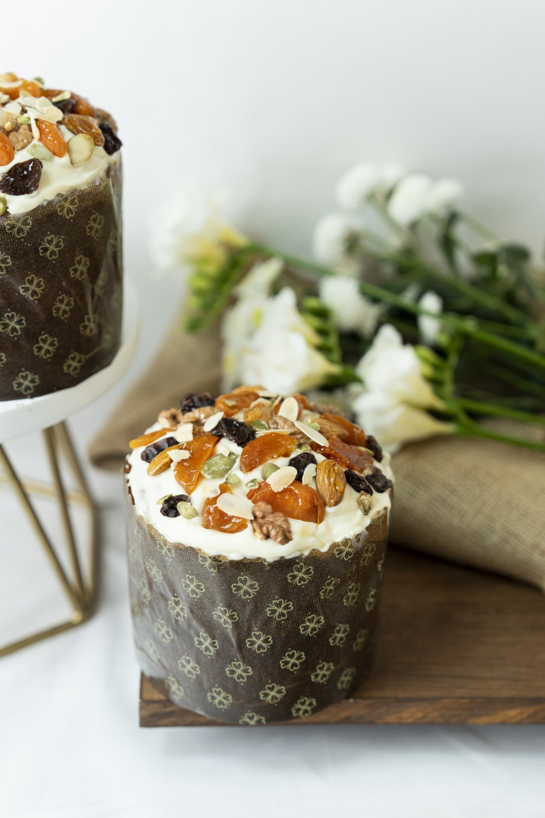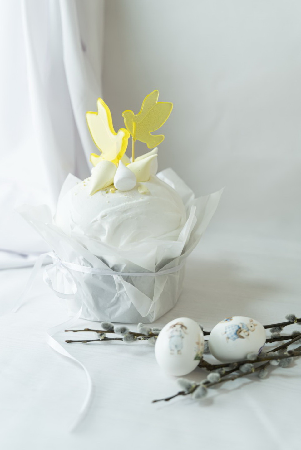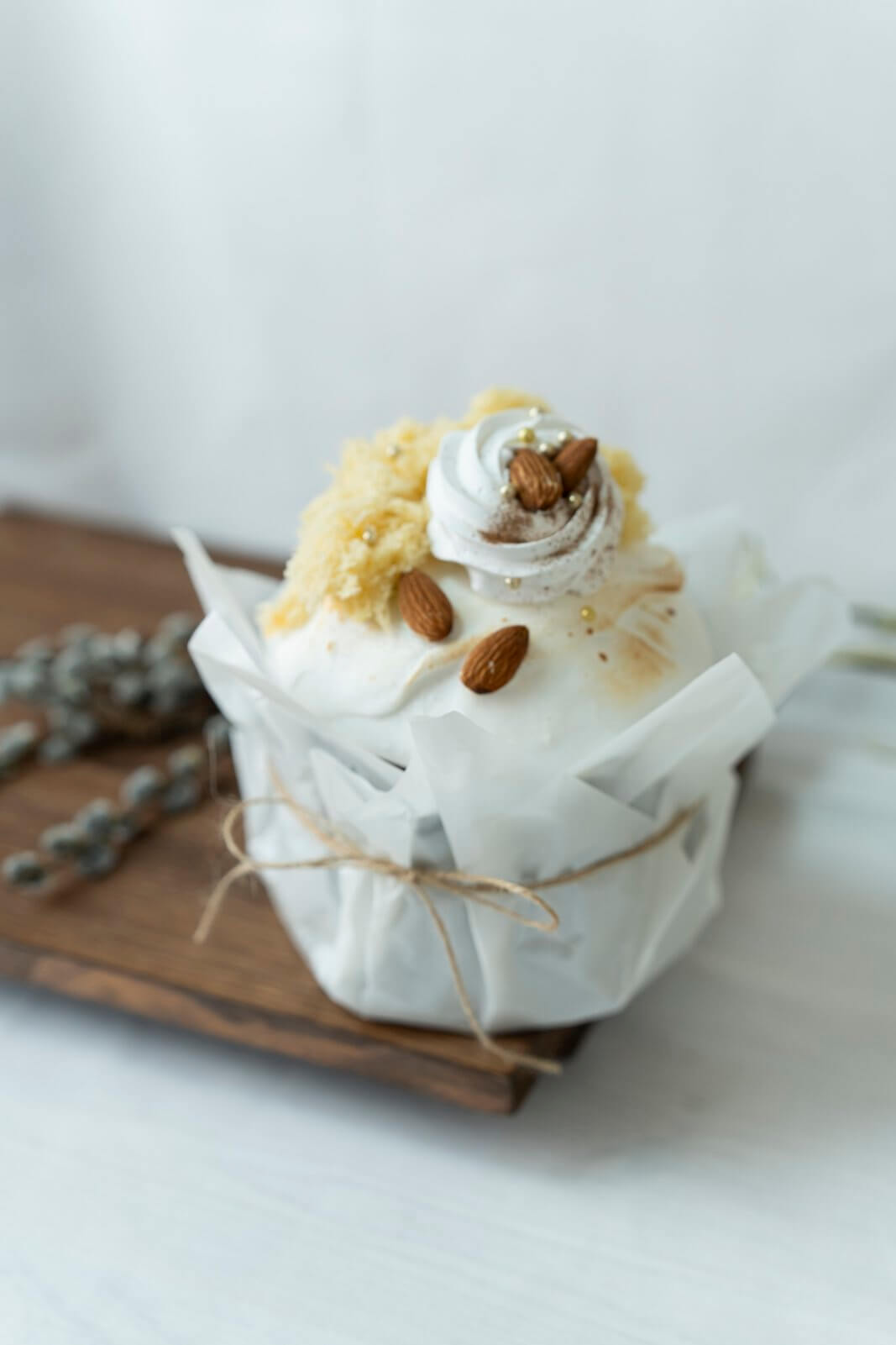 Паска Панеттоне классическая ( без добавления изюма и цукатов), начинка Нутелла. В оформлении белок, молекулярний бисквит, леденец